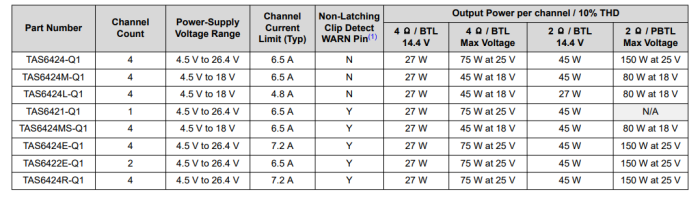 TI德州儀器生產的TAS6424R-Q1 器件是一款采用 2.1MHz PWM 開關頻率的四通道數字輸入 D 類音頻放大器,以非常小的 PCB 尺寸實現成本優化型器件,可針對啟停事件在低至 4.5V 的電壓下全面運行,并可在高達 40kHz 的音頻帶寬下提供出色的音質。