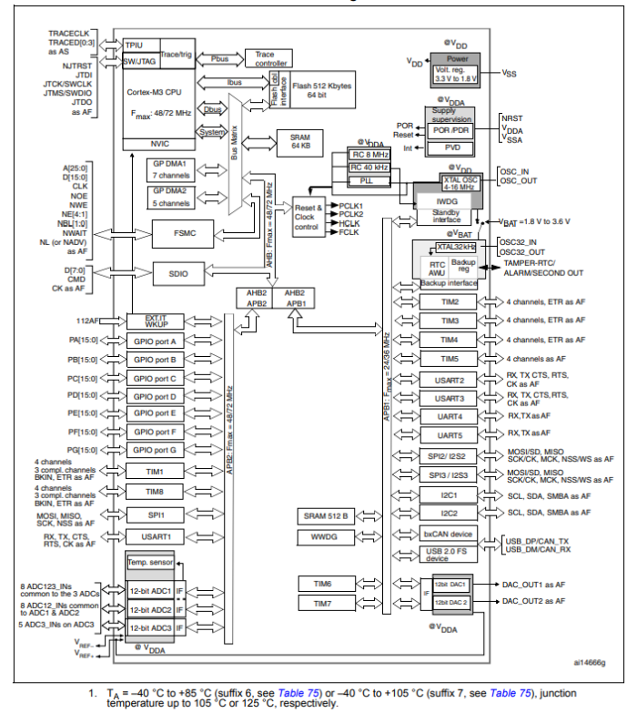 STM32F103xC/D/E高密度性能線系列在–40至+105°C的溫度范圍內運行,電源電壓為2.0至3.6 V。一套全面的節能模式允許設計低功耗應用程序。