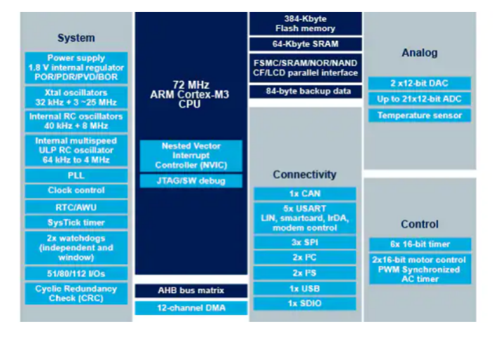 最大頻率72 MHz,0等待狀態內存訪問時的1.25 DMIPS/MHz(Dhrystone 2.1)性能