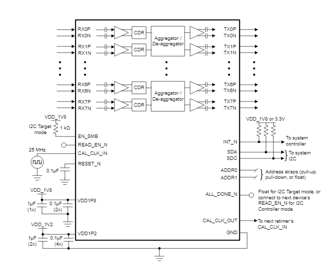 DS560DF810 在 CDR 后的每對(duì)相鄰?fù)ǖ乐g都具有一個(gè)完整的 2x2 交叉點(diǎn)開關(guān),可支持快速、靈活的通道切換以實(shí)現(xiàn)靈活的 PCB 路由,支持 2 到 1 多路復(fù)用和 1 到 2 多路分解以實(shí)現(xiàn)故障轉(zhuǎn)移冗余,還支持 1 對(duì) 2 扇出以實(shí)現(xiàn)診斷監(jiān)控。此外,PCB 上集成了物理交流耦合電容器(TX 和 RX),無需使用外部電容器。這些特性可降低 PCB 布線的復(fù)雜程度并節(jié)省物料清單 (BOM) 成本。