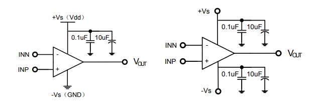 ME321 可以在電源電壓+2.1V~+5.5V,或在雙電源系統電壓±1.05V ~±2.75V 的范圍內工作。對于 單電源系統,電源需要使用旁路電容到地,通常用一個 0.1uF 的陶瓷電容,它必須放置在靠近+V S 引腳 的位置。對于雙電源系統,+V S 和 -V S 都需要用旁路電路耦合到地,通常用一個 0.1uF 的陶瓷電容。 在需要更好應用效果的電路中可以使用 2.2uF 的鉭電容進行替換。如圖所示: