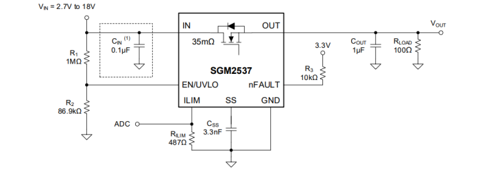 1. SGM2537 支持高達(dá) 18V 輸入電壓,可調(diào)輸出軟起功能有效減少浪涌電流,保護(hù)下游大電流敏感器件并抑制輸入端電壓波動(dòng)。