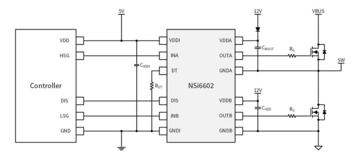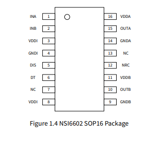 NSI6602是一系列高可靠性的隔離式雙通道柵極驅動器IC, 可以設計為驅動高達2MHz開關頻率的功率晶體管。每個輸出可以以快速的25ns傳播延遲和5ns的最大延遲匹配來提供最大4A/6A的拉灌電流能力。NSI6602在5*5mmLGA13封裝中按照UL1577提供2500Vrms隔離, 在SOP16封裝中提供3000Vrms隔離, 在SOW16和SOW14封裝中提供5700Vrms隔離。100kV/us的最小共模瞬變抗擾度(CMTI)提高系統魯棒性。該驅動器的最大電源電壓為28V,而輸入側則接受3V至5.5V的電源電壓。所有電源電壓引腳均支持欠壓鎖定(UVLO)保護。