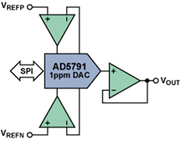 半導體處理技術、DAC架構設計和快速片內校準技術的發展使穩定、建立時間短的高線性度數模轉換器成為可能。這種轉換器可提供高優于1 ppm的相對精度、0.05 ppm/°C溫度漂移、0.1 ppm p-p噪聲、優于1 ppm的長期穩定性和1MHz吞吐量。這類小型單芯片器件保證性能規格,無需校準且簡單易用。AD5791及其配套基準電壓源和輸出緩沖的典型功能框圖如下圖所示。