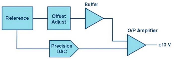 雙極性輸出DAC的主要元件如以上功能框圖所示。它由精密DAC、基準電壓源、基準電壓緩沖器、失調和增益調整以及輸出放大器組成。集成精密基準電壓源以適應16位應用非常困難,但最近的工藝進步和設計技術允許在片內設計和集成具有出色漂移和熱特性的基準電壓源。熱關斷、短路保護等故障保護模式,以及上電/關斷等狀況下的輸出控制,是雙極性DAC通常會集成的重要特性,可以簡化系統設計。DAC提供數字碼以相對于基準電壓轉換輸出電壓。調整模塊提供偏移和調整DAC傳遞函數的功能。