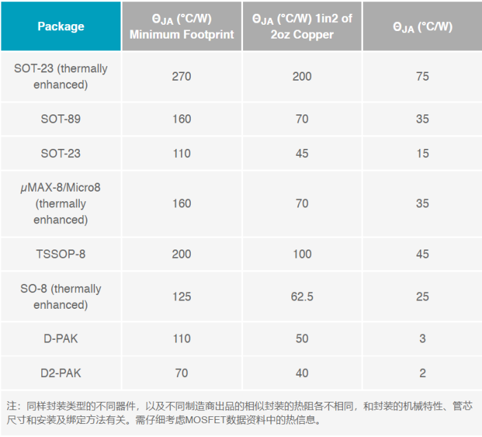 表1. MOSFET封裝的典型熱阻
