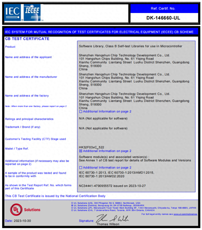 UL Solution為航順簽發IEC 60730認證證書