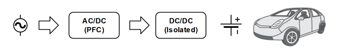 車載充電器(OBC)是電動汽車和混合動力汽車的重要組成部分(HEV)。OBC通常由一個AC/DC(功率因數(shù)校正電路)和一個隔離式DC/DC轉(zhuǎn)換器,如下圖所示: