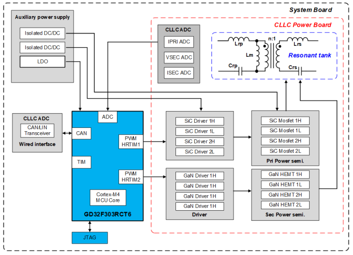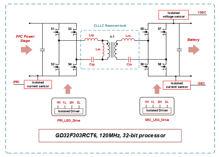 采用GD32F303RCT6微控制器:得益于HRPWM定時與ADC采樣的高精度,使得CLLC將設計頻率提高到500kHz在數(shù)字控制的可實現(xiàn)性上,變成了可能,從而為整機系統(tǒng)的高功率密度和高效率綜合優(yōu)化提供了控制保障