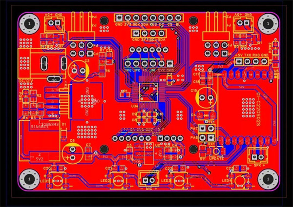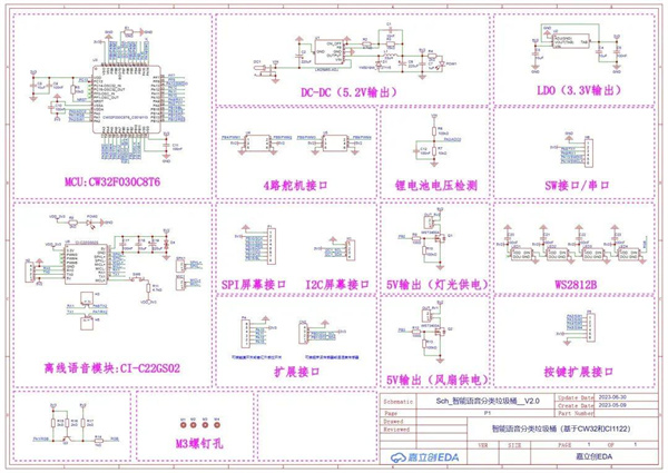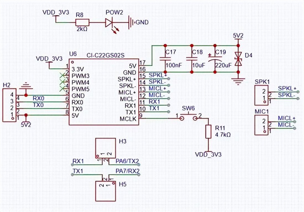 本次設計采用武漢芯源半導體的CW32F030C8T6作為主控,主要負責和離線語音模塊的串口通訊,負責輸出4路PWM信號、驅動IPS顯示屏、控制2路MOS驅動電路(控制風扇和燈光)、驅動4個WS2812B燈。語音識模塊采用啟英泰倫CI-C22GS02模塊(主芯片采用Cl1122,支持本地200條命令詞以下的離線語音識別),主要負責語音識別和播報語音,可通過串口與MCU通訊。