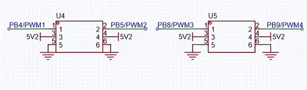 2.主控輸出4路PWM信號(周期20us,頻率50Hz),可直接驅動4路舵機。