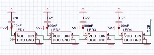 3.四個WS2812B燈作為4類垃圾的指示燈,語音模塊在識別到正確的語音后,由CW32主控來控制指定的燈點亮對應的顏色。
