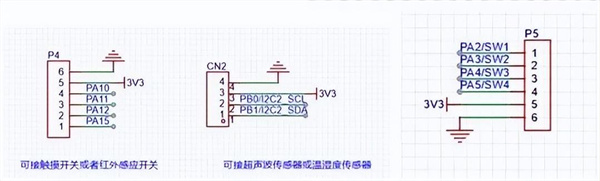 5.電路設計了2路MOS驅動電路,可外接5V的小風扇和5V供電的燈。另外預留了2種屏幕接口,支持8針的SPI接口的屏幕或者4針的I2C接口的屏幕。預留3組擴展接口,將剩余的IO口全部引出,方便擴展。