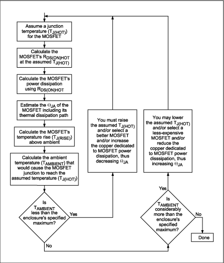 迭代過程始于為每個(gè)MOSFET假定一個(gè)結(jié)溫,然后,計(jì)算每個(gè)MOSFET各自的功率耗散和允許的環(huán)境溫度。當(dāng)允許的環(huán)境氣溫達(dá)到或略高于電源及其所驅(qū)動(dòng)的電路所在的機(jī)殼的期望最高溫度時(shí),這個(gè)過程便結(jié)束了。