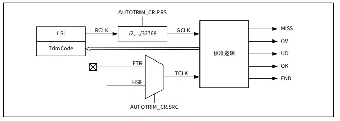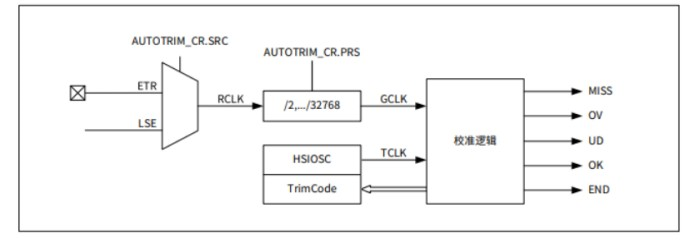HSIOSC 時鐘校準,需要向定時器提供一個精準的低頻參考時鐘,其來源可以是 LSE 或外部 ETR 引腳輸入的低速精準時鐘信號,通過控制寄存器 AUTOTRIM_CR 的 SRC 位域進行選擇。