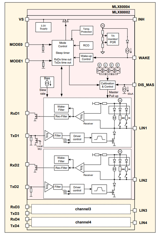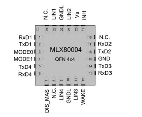 邁來芯 MLX80004 是一款面向采用本地互連網(wǎng)絡(luò) (LIN) 協(xié)議的低速車輛串行數(shù)據(jù)網(wǎng)絡(luò)通信應(yīng)用的四通道物理層器件。該器件設(shè)計(jì)符合 LIN 協(xié)議規(guī)范包 2.x 以及 SAE J2602 標(biāo)準(zhǔn)對物理層的定義。此外,IC 還能用于 ISO9141 系統(tǒng)中。由于 MLX80004 在隱性狀態(tài)下的電流消耗非常低,因此非常適合對待機(jī)電流有嚴(yán)格要求的 ECU 應(yīng)用。高級休眠模式功能可關(guān)斷整個主節(jié)點(diǎn)。該器件包含的喚醒功能可檢測到傳入的顯性 LIN 消息,然后使能穩(wěn)壓器。
