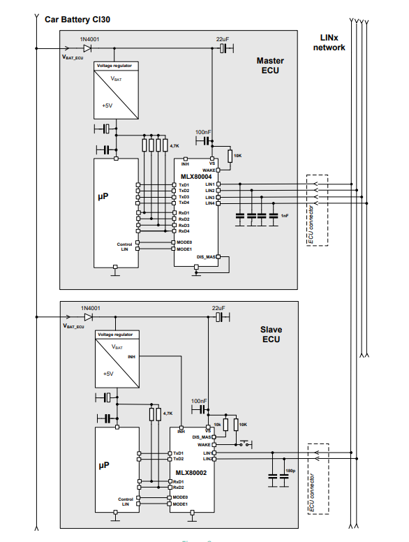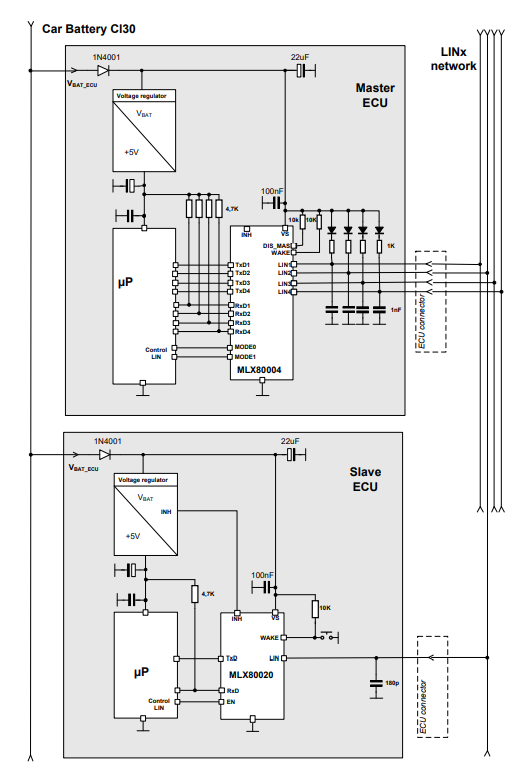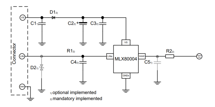 集成LIN 主節(jié)點(diǎn)和從節(jié)點(diǎn)的端(電阻和去耦二極管)
