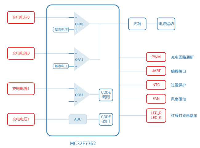 與傳統的充電方案相比,MC32F7362內置了兩路純模擬OPA,并集成了相應的12位和14位DAC,以實現對恒流和恒壓的控制。此外,芯片還內置了一路固定放大倍數的OPA,用于實現小電流的監測與控制。另外,MC32F7362還具備URAT通訊接口,可以在生產和校驗測試環節將準確的校驗值存儲于EEprom內,從而更快更高效地實現批量生產。