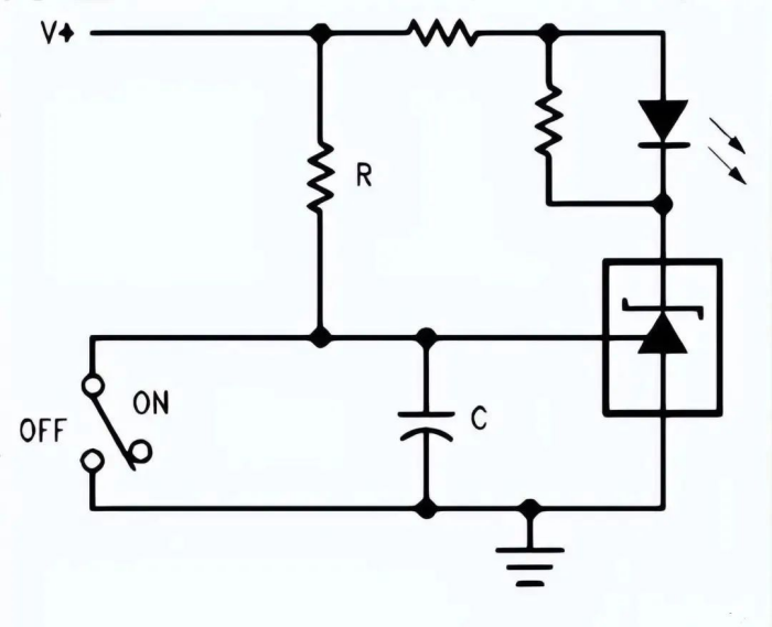 在此應用中,開關閉合后,先給電容 C 充電,電容 C 的電壓充到 VREF 時,LED 被點亮。