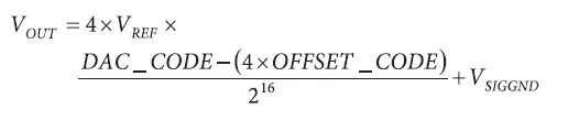 在使用 2.5V 電壓基準的時候,±5V 標稱輸出可以發生偏移,產生 ?10V 至 0V 或 0V 至 +10V 輸出。但是使用 5V 基準電壓時,產生 ±10V 標稱輸出,卻無法利用偏移 DAC 寄存器產生 0V 至 +20V 輸出,因為這超出了電源和裕量限制。DAC 輸出電壓由以下公式決定,值得注意的是 OFFSET 寄存器是 14 位的,AD5362 本身是 16 位的,所以需要將 OFFSET_CODE 乘以 4。VSIGGND 為相關 SIGGND 引腳上的電壓,通常為 0V。