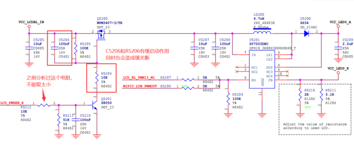 需要注意的是C5206和R5206是起緩啟動作用的,但是由于C5206的本質是增加了PMOS的Cgs電容,所以在啟動緩啟動的同時,也會關斷緩關斷。(Cgs充放電時間都變長)可以電路需求更改電容和電阻從而更改緩啟動時間。