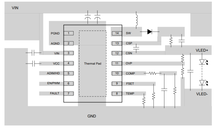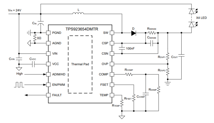 TPS923655DMTR器件還提供多種系統(tǒng)保護,包括 LED 開路和短路、檢測電阻開路和短路、可配置熱折返以及 熱關(guān)斷。一旦檢測到任何故障情況,故障輸出就會發(fā)送 確認信號。