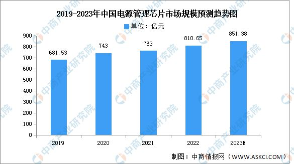 近年來,中國電源管理芯片市場規模一直保持增長趨勢,2021年市場規模約為763億元,同比增長2.69%。2022年市場規模約為810.65億元,隨著下游電子設備行業發展對電源管理芯片需求的增長,未來市場規模仍將保持增長,預計2023年市場規模將達851.38億元。