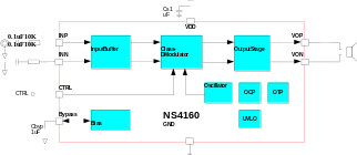 NS4160是單聲道帶AB類,D類工作模式切換功能的音頻功率放大器。芯片內(nèi)部集成了反饋電阻,放大器的增益可以在外圍通過輸入電阻設(shè)置。其原理框圖如下:
