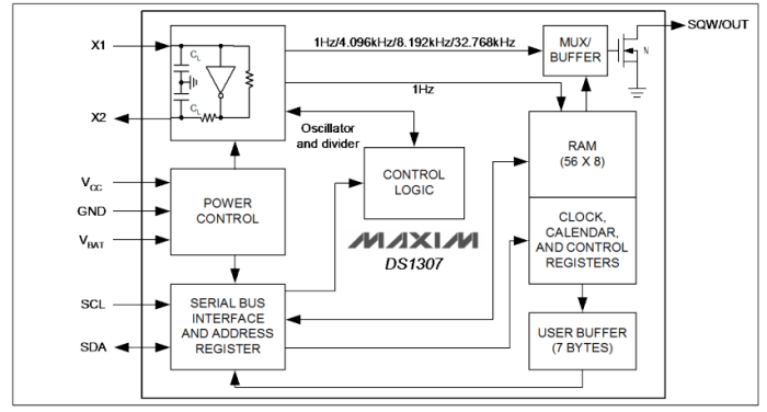 美信DS1307ZN串行實時時鐘(RTC)是一款低功耗、二-十進制編碼(BCD)的時鐘/日歷,外加56字節NV RAM。地址與數據通過I2C接口串行傳輸。時鐘/日歷提供秒、分、時、星期、日、月和年信息。對于少于31天的月份,將自動調整月末日期,包括閏年修正。時鐘格式可以是24小時或帶AM/PM指示的12小時格式。DS1307內置電源檢測電路,檢測主電源失效時自動切換到備用電源,以保持時間、日期信息和計時。