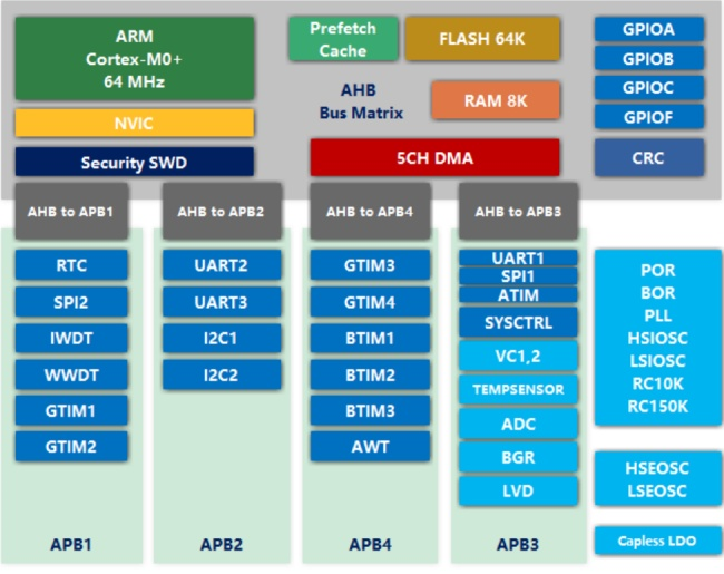 CW32A030C8T7是基于ARM? Cortex?-M0+內核,采用Prefetch+Cache架構,以64MHz為量產測試保證,芯片配置64K字節FLASH,8K 字節RAM,128字節OTP存儲器。芯片采用1.65 5.5V寬電壓供電,工作溫度范圍-40+105℃。