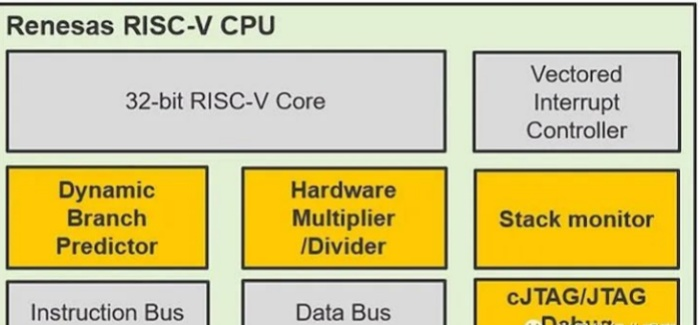 雖然瑞薩電子尚未透露將使用其內部核心的部件的完整產品細節,但它已經確認了有關核心本身的一些技術細節。框圖顯示了單個 32 位 RISC-V 內核,具有性能提升的動態分支預測器、硬件乘法器/除法器、向量中斷控制器、堆棧監視器寄存器、獨立的指令和數據總線以及緊湊型 JTAG (cJTAG)/ JTAG 調試功能。它還承諾 3.27 CoreMark/MHz)的性能水平——盡管時鐘速度尚不清楚。