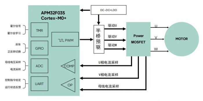 極海APM32F035電機控制專用MCU作為此應用方案的主控,負責采集霍爾信號、電流、電壓信號,執行電機控制邏輯,接收控制指令以及反饋電機運行狀態。具體來說,APM32F035通過檢測霍爾信號、母線電壓信號以及電機的相電流信號,輸入到MCU內部,同時在MCU內執行電機算法邏輯;隨后通過Timer1輸出6組互補的PWM信號來驅動電機,保障電機高效、平穩、低噪聲運行。值得說明的是APM32F035內部集成4路獨立運放模塊,在進行電機相電流采樣時,不需要外置運放進行信號調制。