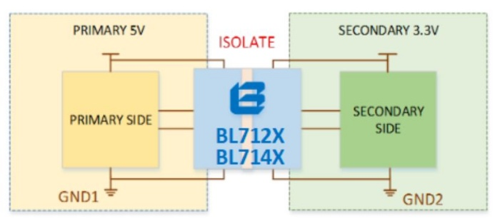 如圖1所示場景,原側為5V電平,次級側為3.3V電平,兩側不共地。在類似于該場景下的多電源域的隔離電平轉換應用中,使用BL712X/BL714X系列數字隔離芯片設計電平轉換電路,除了具有傳輸速率高、耐壓高、外圍器件電路簡單的特點,還有節約PCB空間,方便集成在各個系統等優勢。