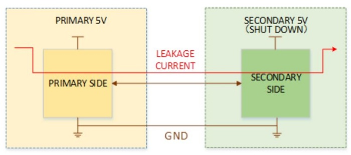 圖2原側開啟,而次級側關閉,該情況下會引起原側到次級側漏電;若要避免泄漏電流,則必須將數字線設為低電平輸出或高阻抗模式。