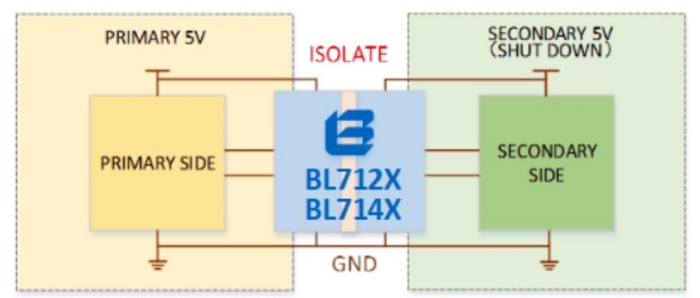 為了避免上述問題的發生,從圖3即可看出,使用BL712X/BL714X系列數字隔離器代替兩個電源域直接連接時,即可阻斷其間的泄漏電流。由于此時無需控制輸出狀態,因此可簡化硬件和軟件的保護設計。