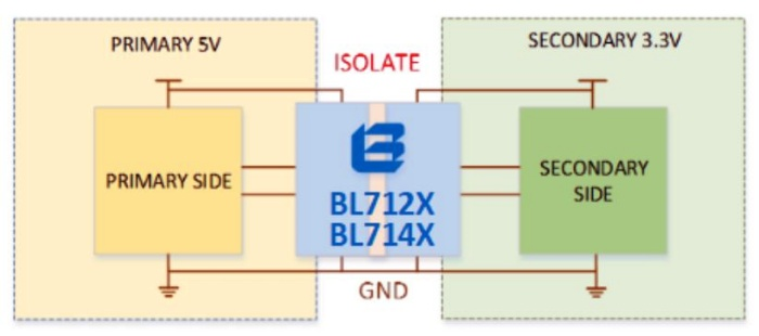 使用BL712X/BL714X系列數字隔離器在非隔離共地的情況下實現電平轉化,替代專用電平轉化芯片同樣可解決高側向低測漏電問題(圖4)。