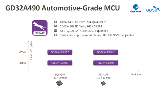 ▲GD32A490系列Cortex?-M4內(nèi)核車規(guī)級MCU GD32A490系列車規(guī)級MCU采用Arm? Cortex?-M4內(nèi)核,運行主頻高達240MHz,配備了高達3072KB片上Flash,以及768KB SRAM。支持代碼執(zhí)行零等待,性能可達355 DMIPS。還集成了豐富外設(shè)資源,提供多達4個USART和4個UART,3個I2C,6個SPI,2個I2S,其中USART支持與LIN通信互傳。 為滿足車載網(wǎng)關(guān)的應(yīng)用所需,還支持2個CAN2.0B、100M以太網(wǎng)及USB2.0 FS/HS通信。片上集成了TFT LCD控制器及各種多媒體接口,適合車載中控、娛樂影音、儀表盤等多元化場景。 GD32A490配備了3個采樣速率高達2.6M SPS的12位高速ADC和2個12位DAC以支持車用電機控制,多達140個GPIO可以實現(xiàn)BCM模塊多負載控制。該系列MCU提供了BGA176和LQFP144兩種封裝、四個型號選擇,目前已經(jīng)正式量產(chǎn)供貨。 ▲GD32A490系列車規(guī)MCU產(chǎn)品組合 GD32A490的推出進一步擴大了GD32A系列車規(guī)MCU的產(chǎn)品陣容。得益于GD32家族豐富完善的生態(tài)系統(tǒng),用戶沿用已有的GD32調(diào)試量產(chǎn)工具、技術(shù)文檔、軟硬件平臺即可開發(fā)車規(guī)級項目,配套的GD32A490I-EVAL全功能評估板以及GD32A490Z-START入門級學習套件同步上市。 兆易創(chuàng)新的產(chǎn)品開發(fā)和管理體系已通過ISO 26262:2018汽車功能安全最高等級ASIL D流程認證,持續(xù)以高品質(zhì)和高安全性的車規(guī)產(chǎn)品與服務(wù),提升國產(chǎn)汽車在全球的競爭力。關(guān)于GD32 MCU 兆易創(chuàng)新GD32 MCU是中國高性能通用微控制器領(lǐng)域的領(lǐng)跑者,中國最大的Arm? MCU家族,中國第一個推出的Arm? Cortex?-M3、Cortex?-M4、Cortex?-M23、Cortex?-M33及Cortex?-M7內(nèi)核通用MCU產(chǎn)品系列,并在全球首家推出RISC-V內(nèi)核通用32位MCU產(chǎn)品系列,已經(jīng)發(fā)展成為32位通用MCU市場的核心之選。以累計超過15億顆的出貨數(shù)量,超過2萬家客戶數(shù)量,45個系列550余款產(chǎn)品選擇所提供的廣闊應(yīng)用覆蓋率穩(wěn)居中國本土首位。 兆易創(chuàng)新GD32 MCU也是Arm?大學計劃(University Program, AUP)中國首批合作伙伴、Arm? mbed? IoT平臺生態(tài)合作伙伴、RISC-V基金會戰(zhàn)略會員、“兆易創(chuàng)新杯”中國研究生電子設(shè)計競賽的冠名廠商。GD32以打造“MCU百貨商店”規(guī)劃發(fā)展藍圖,為用戶提供最全面的系統(tǒng)級產(chǎn)品和解決方案支撐,構(gòu)建智能化開發(fā)平臺和完善的產(chǎn)品應(yīng)用生態(tài)。更多信息歡迎訪問GD32MCU.com。 關(guān)于兆易創(chuàng)新 兆易創(chuàng)新科技集團股份有限公司(股票代碼603986)是全球領(lǐng)先的Fabless芯片供應(yīng)商,公司成立于2005年4月,總部設(shè)于中國北京,在全球多個國家和地區(qū)設(shè)有分支機構(gòu),營銷網(wǎng)絡(luò)遍布全球,提供優(yōu)質(zhì)便捷的本地化支持服務(wù)。兆易創(chuàng)新致力于構(gòu)建以存儲器、微控制器、傳感器、模擬產(chǎn)品為核心驅(qū)動力的完整生態(tài),為工業(yè)、汽車、計算、消費電子、物聯(lián)網(wǎng)、移動應(yīng)用以及通信領(lǐng)域的客戶提供完善的產(chǎn)品技術(shù)和服務(wù),已通過ISO26262:2018汽車功能安全最高等級ASIL D體系認證,并獲得ISO 9001、ISO 14001、ISO 45001等體系認證和鄧白氏認證,與多家世界知名晶圓廠、封裝測試廠建立戰(zhàn)略合作伙伴關(guān)系,共同推進半導體領(lǐng)域的技術(shù)創(chuàng)新。