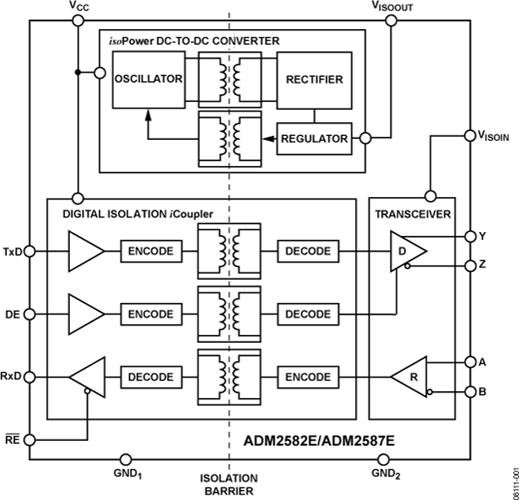 它采用ADI公司的iCoupler?技術,在單個封裝內集成了一個三通道隔離器、一個三態差分線路驅動器、一個差分輸入接收器和一個isoPower DC/DC轉換器。該器件采用5V或3.3V單電源供電,從而實現了完全集成的信號和電源隔離RS-485解決方案。