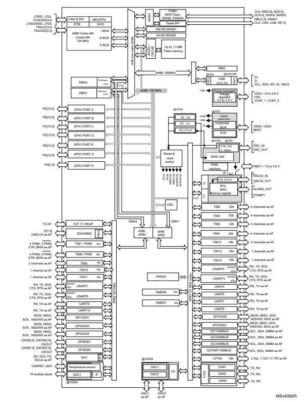 STM32F413CGU6提供一個12位ADC、兩個12位DAC、一個低功耗RTC、12個通用16位定時器,包括兩個用于電機控制的PWM定時器、兩個通用32位定時器和一個低功率定時器。