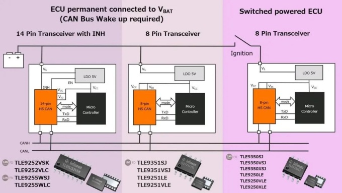 在 ECU 永久連接到 Vbat 時,無論發動機開關狀態,ECU 始終連接電池的應用。如下圖 (圖1) 左邊所示,帶有 INH 14pin 收發器,該產品可用于微控制器的電源IC(LDO) 由收發器的 INH 引腳控制、微控制器的電源關閉以進一步降低非工作期間的電流消耗的應用。8pin 收發器,該產品適用于不需要對微控制器的電源 IC (LDO) 進行使能控制、但需要微控制器從睡眠或待機狀態進入正常工作狀態以響應喚醒信號的應用。