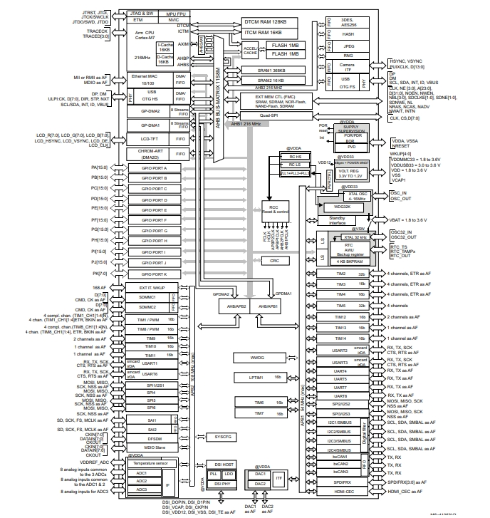 連接能力:CANbus,EBI/EMI,以太網,I2C,IrDA,LINbus,MMC/SD/SDIO,QSPI,SAI,SPDIF,SPI,UART/USART,USB OTG 外設 欠壓檢測/復位,DMA,I2S,LCD,POR,PWM,WDT