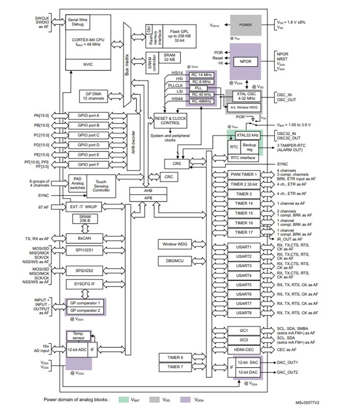 STM32F098RCH6提供標準通信接口(兩個i2c,兩個spi/一個I2S,一個HDMI CEC和多達8個usart),一個CAN,一個12位ADC,一個帶兩個通道的12位DAC, 7個16位計時器,一個32位計時器和一個高級控制PWM計時器。