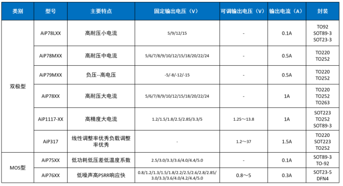 LDO指的是低壓差線性穩(wěn)壓器,是一種輸入電壓大于輸出電壓的直流交流穩(wěn)壓器,可以分為雙極型和MOS型。雙極型LDO可以承受高輸入電壓,靜態(tài)電流為mA級別,MOS型LDO噪聲更小,靜態(tài)電流相比于雙極型也更低,一般在uA級別。 中微愛芯已開發(fā)的雙極型LDO有78XX系列、79XX系列、AiP1117系列、AiP71XX系列等,MOS型LDO有AiP75XX系列和AiP76XX系列,涵蓋正電源穩(wěn)壓器、負電源穩(wěn)壓器,低壓差正電源穩(wěn)壓器、輸出電壓調整電路、低壓差穩(wěn)壓器、可調精密并聯(lián)穩(wěn)壓器等多種類型。以AiP1117-ADJ為例,這是一款最大輸出電流為1A的低壓差穩(wěn)壓器,內置溫度保護,外接電阻即可實現(xiàn)輸出電壓可調,可廣泛應用于各種需要高精度,低壓降正向穩(wěn)壓場合。