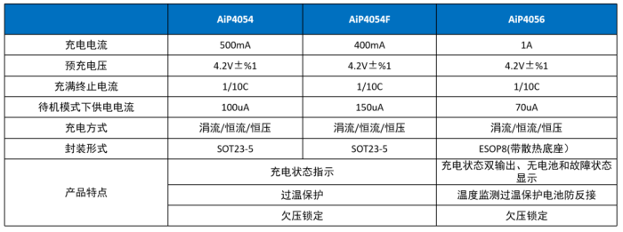中微愛芯電池管理產品線涵蓋鋰電池和鋰磷酸鹽電池管理監(jiān)控器、線性鋰電池充電芯片,其中線性鋰電池充電芯片的有多種充電電流可選。以AiP4054為例,這是一款專門為單節(jié)鋰電池設計的線性充電芯片,內置完善的保護電路(電流監(jiān)控、欠壓鎖定、自動再充電、過溫保護、狀態(tài)指示功能),充電電流可編程,安全性較高。此外,AiP4054采用體積較小的SOT23-5封裝,外圍電路簡單,非常適用于物流箱藍牙鎖、TWS耳機充電倉、電子煙等低功耗、小體積、快速充電的場合。 常見的電池管理芯片有AiP4056、AiP4054系列等。