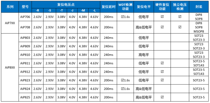 中微愛芯提供帶看門狗功能處理器復位電路、微處理器復位電路、電壓檢測電路等多種電源監(jiān)控芯片,擁有齊全的復位電壓點。以AiP706為例,這是一款帶看門狗功能的微處理器監(jiān)控電路芯片,內置復位電路和看門狗定時器(1.6秒超時)。AiP706微處理器監(jiān)控電路降低了監(jiān)控系統(tǒng)中電源和電池功能所需的復雜性和組件數量,非常適用于光伏發(fā)電系統(tǒng)。 常見的復位芯片有AiP38XX系列,AiP7XX系列和AiP8XX系列,我司設計多種封裝可供選擇,應用場景廣泛