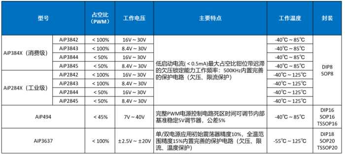 脈寬調制(PWM)是指脈沖寬度調制,也可稱之為定頻調寬,即開關頻率保持恒定,而通過改變在每一個周期內的驅動信號的占空比來達到調制的目的。當輸出電壓發(fā)生變化時,通過環(huán)路的控制,便會使驅動信號的占空比發(fā)生改變,從而維持輸出電壓的恒定。 中微愛芯可提供輸出占空比<100%或<50%的電流模式PWM控制器、直流馬達驅動的PWM控制器。以AiP494為例,這是一款固定頻率脈沖寬度調制電路,集成PWM控制電路所需的幾乎全部模塊,外圍電路簡單。提供共發(fā)射極/共集電極輸出,可用于驅動橋式或推挽電路開關管。常見的電源PWM控制器有AiP384X系列、AiP284X系列等,廣泛應用于工業(yè)控制、消費電子等場合。