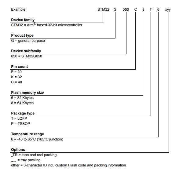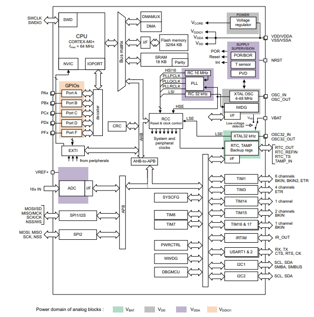 STM32G050K8T6包括存儲器保護單元(MPU)、高速嵌入式存儲器(18 KB SRAM和高達64 KB閃存程序存儲器,具有讀保護、寫保護、專有代碼保護和安全區域)、DMA、廣泛的系統功能、增強的I/O和外圍設備。