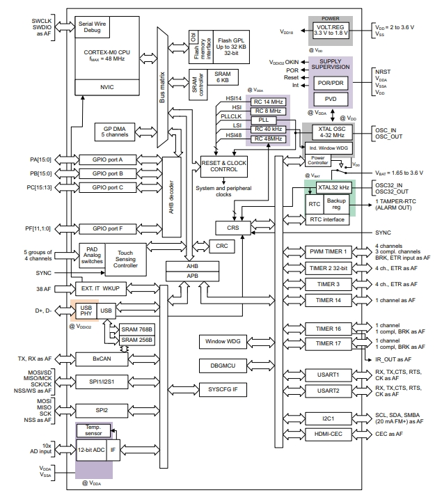 STM32F042K6T7的功能方框圖