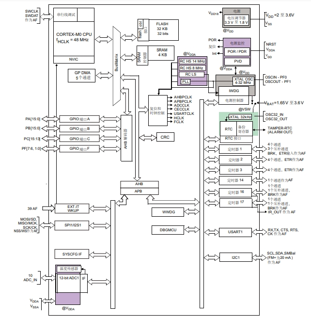 意法半導(dǎo)體STM32F031E6Y6TR的功能方框圖