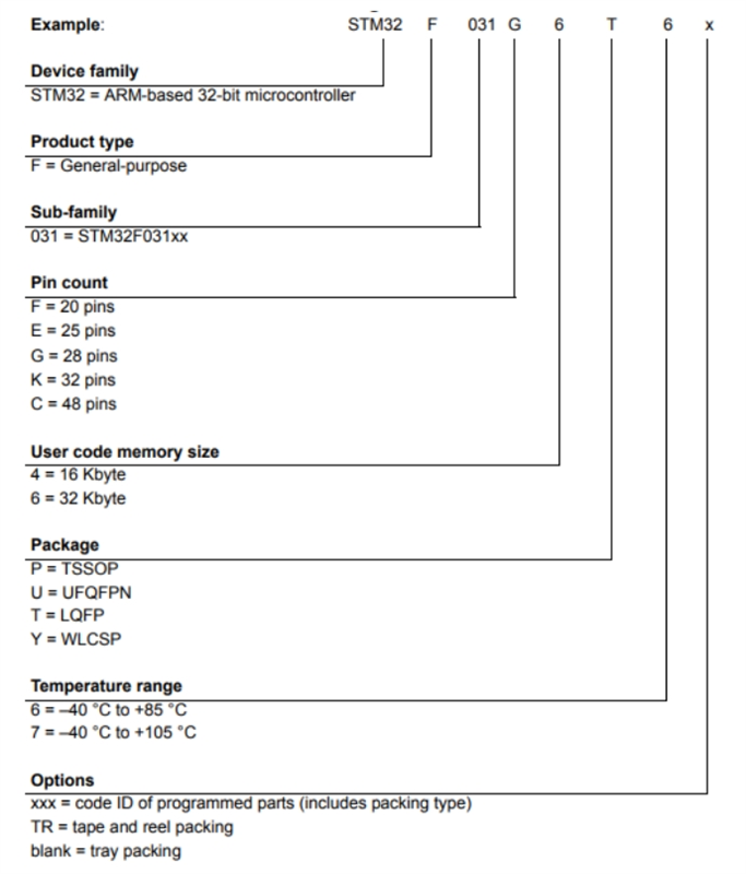 意法半導(dǎo)體STM32F031E6Y6TR的型號(hào)解釋圖